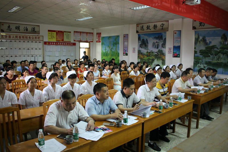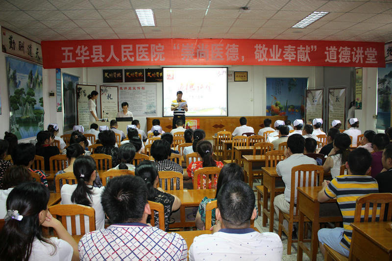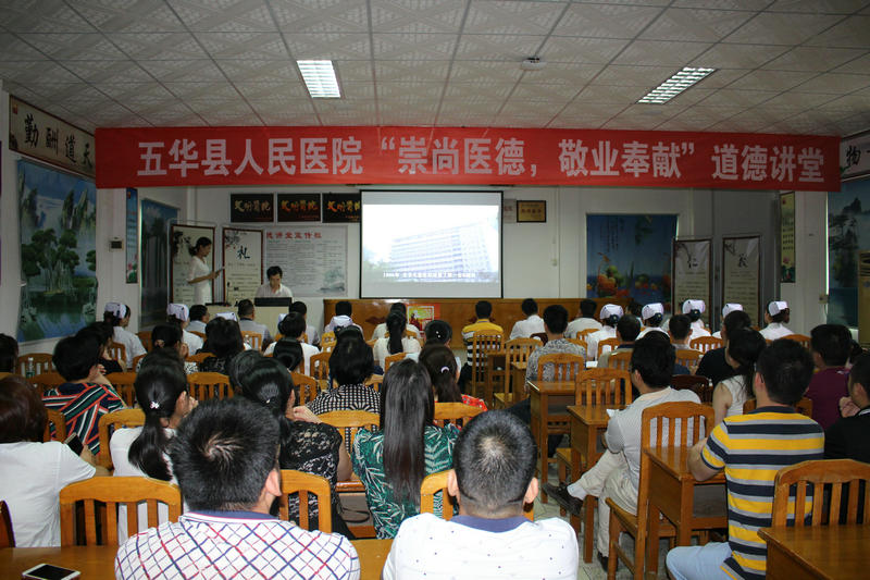 为切实做好医院道德讲堂建设,充分发挥道德模范、身边好人的示范引领作用。 6月16日下午3时,我院在医院办公楼四楼会议室举办“崇尚医德、敬业奉献”为主题的道德讲堂活动,活动邀请了县文明办主任周惠雄及县卫计局创文办主任谢文才等四位同志参加,院班子全体成员,医院中层以上干部职工约130人参加了会议。会议分十个议程进行,分别是:院长致辞、自我反省、唱歌曲、看短片、学模范、诵经典、做承诺、谈感想、送吉祥、县文明办主任讲话。